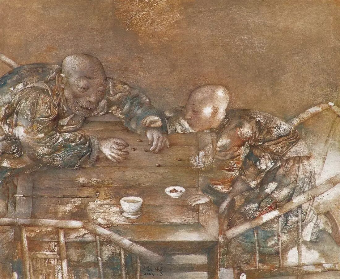 我最近曾再到成都探访曹辉,对他两个近作印象特别深刻:其中一幅巨型的画,画的是昔日一家团圆的场面,另一个是画卷,描绘茶馆里从早到晚的活动。这都是曹一向喜欢处理的题材,但他在这两个作品里,达到前所未有的艺术高度。我衷心希望这两个作品最后会成为某家博物馆或美术馆的珍藏,因为它们完全有资格与史上最伟大的艺术作品共济一堂。