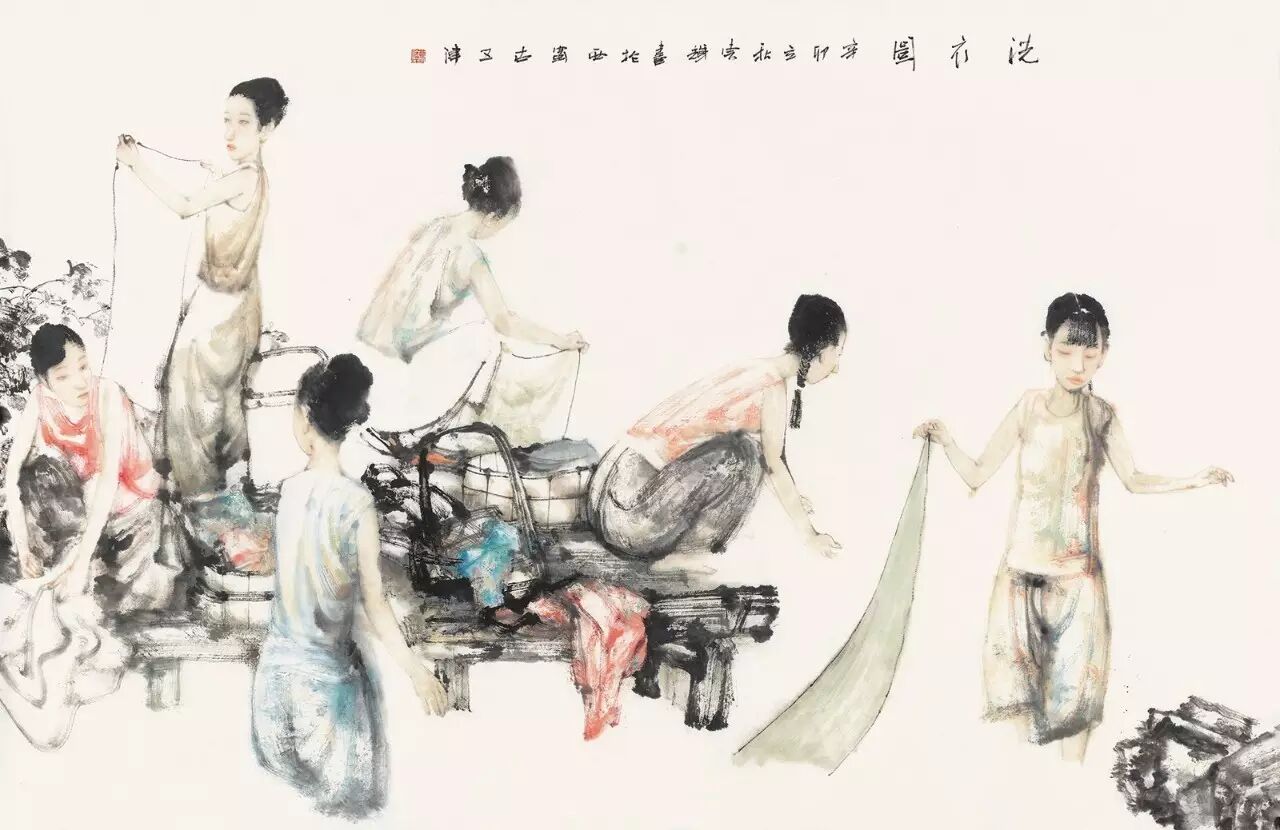 曹辉,洗衣图,纸本设色,136.5×89cm,2011