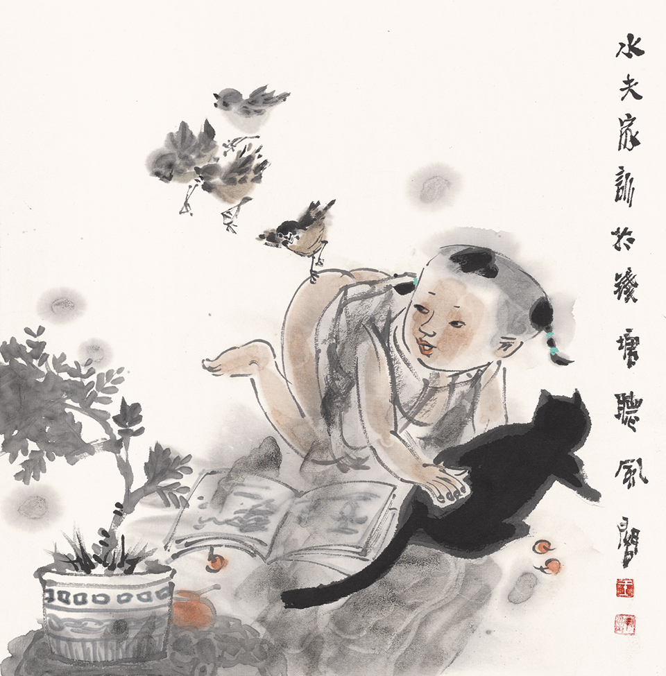 王家训的人物画,既形神兼备,又从容淡定,不事张扬,不炫耀技巧,一切随心性率意而为,笔墨则在工笔与写意之间依题材、内容确定;譬如,一类是描绘民间世俗生活情景的作品,用笔工细谨严,汲取了陶瓷画法和民间年画的夸张、幽默手法,以线描与工笔画风相结合的手法去呈现一种古老的民间生活方式和情趣;用线流畅,色彩淡雅且富于装饰性与空间平面化,人物在约定俗成的符号化表现中融入了鲜活感和生动性;在承继了古老的传统形式表现中,赋于其民间世俗生活的生命力,并从中焕发出浓郁的东方文化气息与诗意底蕴。