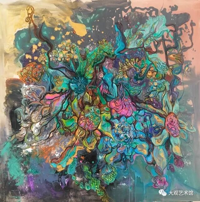 道德经里说:“有生于无”“道生一,一生二,二生三,三生万物”,我的绘画也是,用线隐喻了一种力量,一根线有无穷尽的幻化和可能。从起点开始,似乎永无终点,线和色彩的结合,贯穿在我的整个画面里,线里有色,色中有线。就好似在虚渺的浩瀚的背景下,无数闪着微光的力量交互穿插链接,然后幻化成万物。