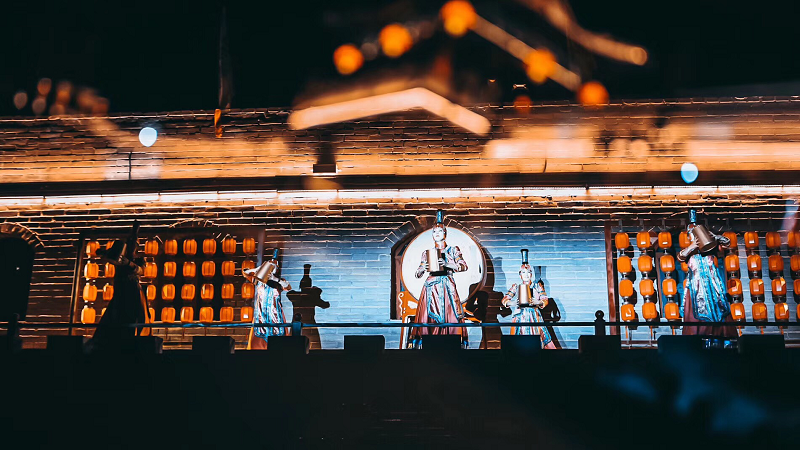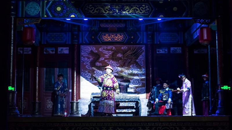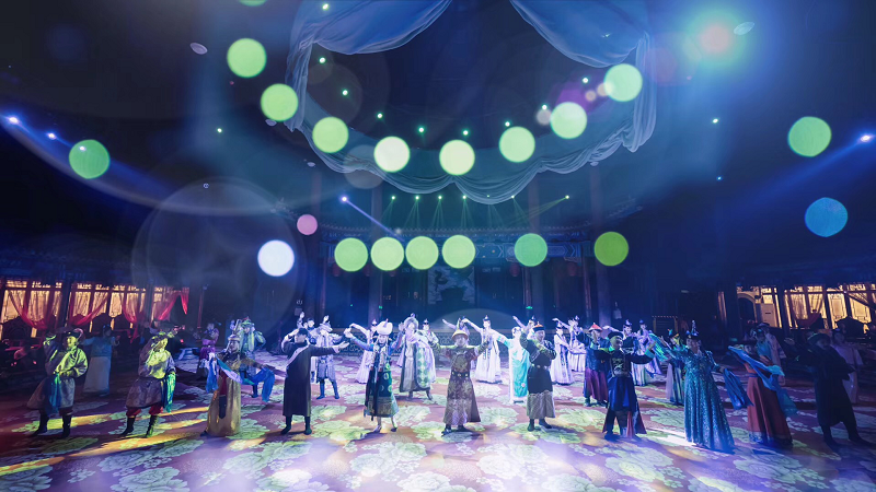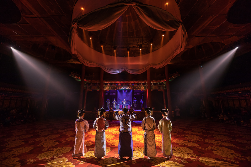 赵章翔在《王府盛宴》的构建中,有突破,有创新,但对于舞美设计,他坚持以电影导演的视角去精心呈现。《王府盛宴》演出地点是王爷府内的戏楼,身后是灯火辉煌的营盘山,营造出与历史、自然、传统充分融合的实景舞台,让观众随剧情穿越在三百年的沧桑变迁中,雍容华贵的舞美视觉与灯光技术的完美结合,使演出场景的层次更加丰富,给观众留下了深刻的印象。
